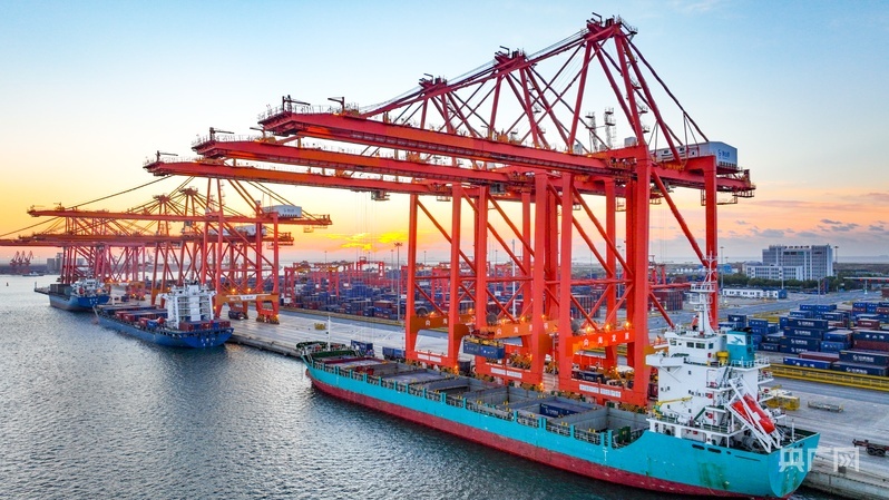 在唐山港京唐港自动化集装箱码头,无人运输车在午后的阳光下有序地来回行驶。在这些“被移植的聪明人”背后,有一个密集的航线网络将他们与世界连接起来。如今,这座现代化智慧港口正“破浪前行”,不断为海洋经济高质量发展注入动能。
