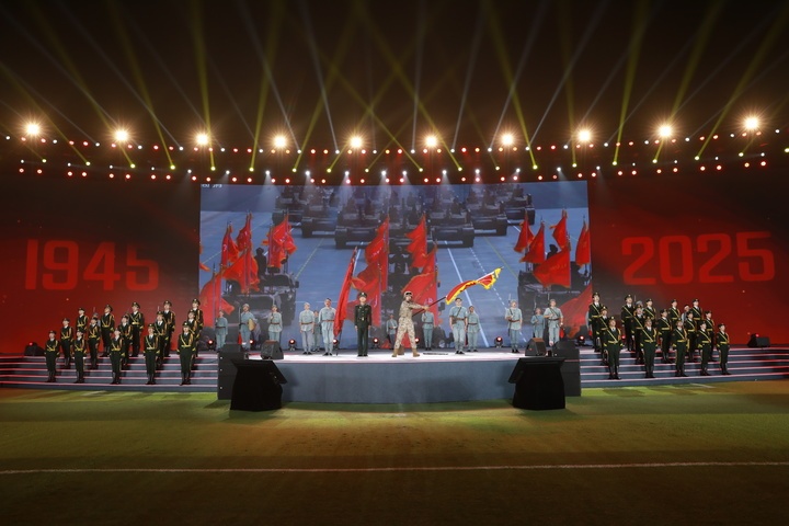 当军旗展开时,王慎义郑重地说:“我们一定要更加牢牢地握住这面军旗,高举它!”军旗指明了前进的方向。他嘱咐在场师生:想想民族的屈辱,想想我们的抗战先辈的精神和革命先烈的精神。你们忘记了吗?”观众异口同声:“我们没有忘记!我们没有忘记!我们永远不会忘记它!”