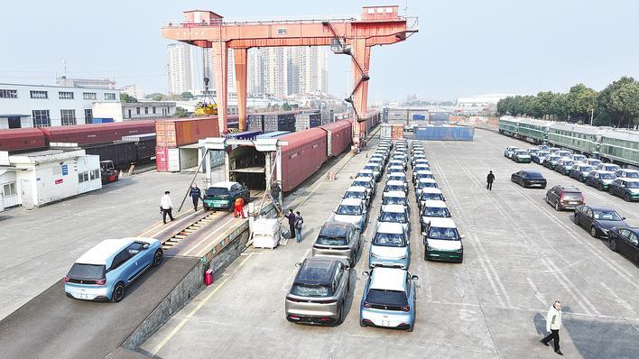12月18日,在湖北邗江铁路运输有限公司利康货场,东风纳诺01正有序装上列车,即将通过铁路运往白俄罗斯。该订单总计1500台,是该工厂有史以来在单一国外市场下的最大订单。今年6月以来,东风一派科技襄阳工厂已紧急生产白俄罗斯订单4个,共计4000台。 (世界网王虎、李旭辉供图)